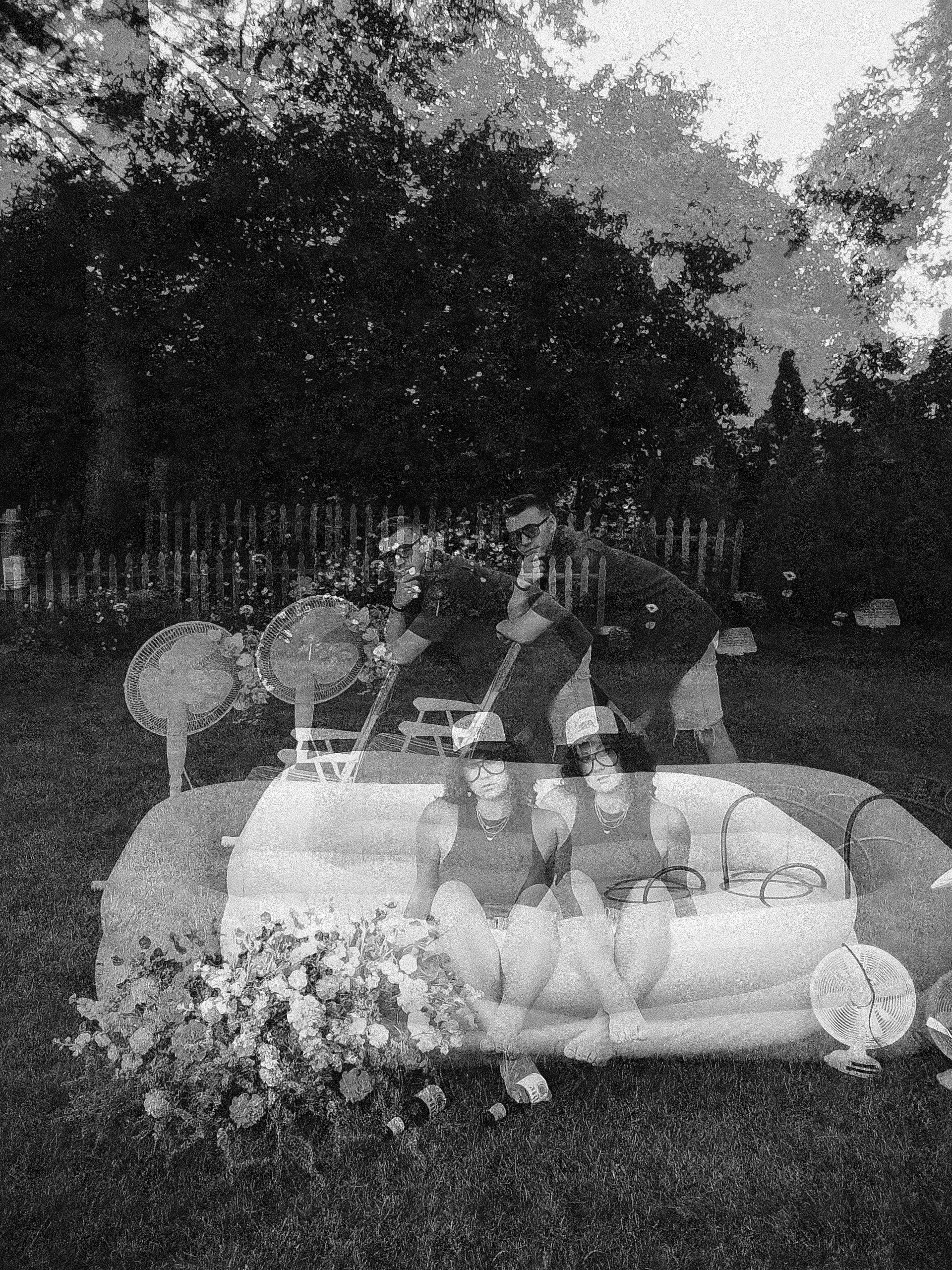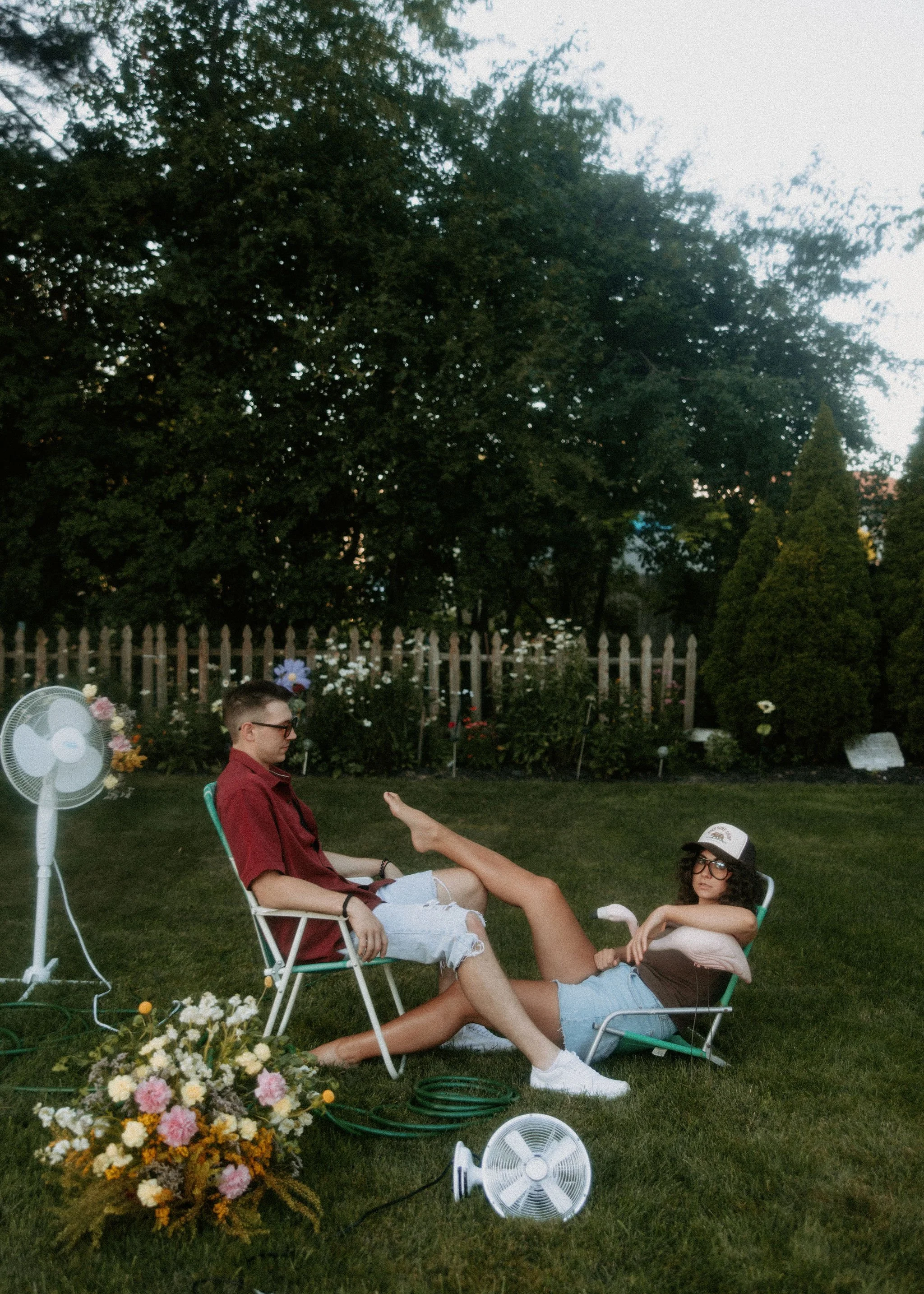 The inspiration for this unconventional session came from Nick's own backyard, a hidden gem that was the perfect canvas for their love story. What sealed the deal was the nostalgia of a picture the couple had taken together in a kiddie pool at the start of their journey. Nick's dad had the pink flamingo which made for such a fun prop and matched the vibe perfectly!